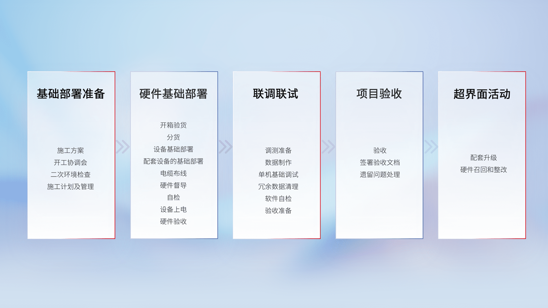 从基础部署准备、、、、硬件基础部署、、、联调联试、、、、项目验收、、越界面活动的全过程可追溯,,,,保证施工质量和进度。。。